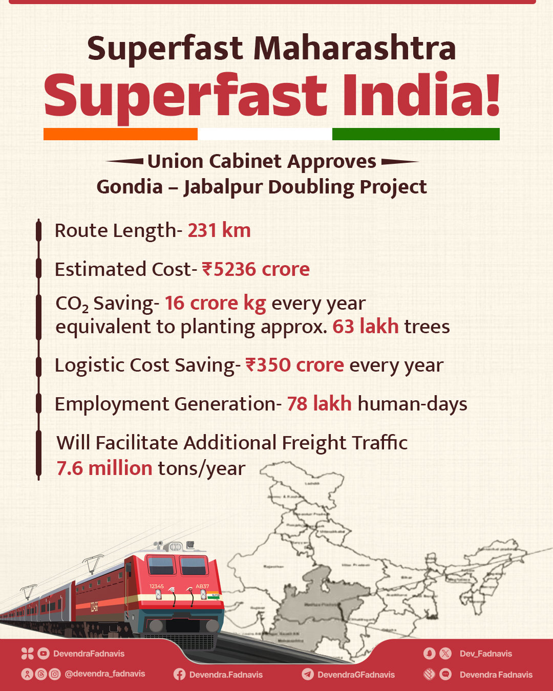महाराष्ट्र, मध्य प्रदेश, बिहार आणि झारखंड या चार राज्यांतील8 जिल्ह्यांमध्ये राबविण्यात येणाऱ्या या प्रकल्पांमुळे भारतीय रेल्वेच्या विद्यमान जाळ्यात सुमारे 307 कि.मी.ची भर पडणार आहे. यामध्ये गोंदिया-जबलपूर दुहेरीकरणासोबतच पुनारख-किऊल आणि गम्हरिया-चांडिल या मार्गांच्या तिसऱ्या आणि चौथ्या लाईनच्या कामांचा समावेश आहे.